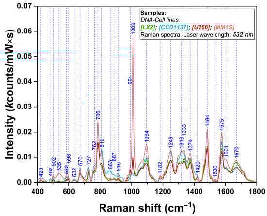 Raman measurements performed on double-stranded (ds) DNA samples isolated from normal (LX2&CCD1137) and MM cells (U266&MM1S) are presented in Figure 1. One can notice that in the case of all DNA samples, there are some high-intensity vibrational bands located at 670, 727, 786, 1009, 1094, 1249, 1333, 1374, 1484, and 1575 cm−1.