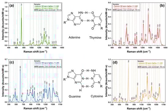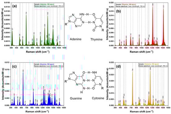 Raman spectra of DNA bases (a) A (green), (b) T (red), (c) G (blue), and (d) C (orange) recorded with a 785 nm excitation laser. The geometry of interaction occurring between the complementary bases is also highlighted in the figure.