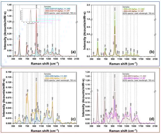 SERS spectra of DNA obtained from (a) CCD1137Sk (red—RT; jade—94 °C), (b) LX2 (scarlet red—RT; green—94 °C), (c) U266 (orange—RT; blue—94 °C), and (d) MM1S cells (viva magenta—RT; brown—94 °C). The spectra were recorded using a NIR (785 nm) excitation laser.