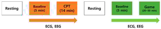 After screening at the hospital by a certified psychiatrist, the experimental procedure including the measurement of biosignals was carried out in a laboratory-based environment. Electrodes for recording electroencephalograms (EEGs) and electrocardiograms (ECGs) were attached to the participant while sitting in a chair. An five-minute baseline EEG and ECG were recorded with the participant in a resting state after sufficient rest for the CPT session (Figure 1). After baseline measurements were performed, EEGs and ECGs were recorded while the participant was performing a 14 min CPT [] consisting of 18 blocks of 20 trials per block. In a total of 360 trials, one letter was randomly presented for each trial, and the subject was instructed to respond by pressing the corresponding key for the letter as quickly as possible—except for the letter X []. After completing the CPT, participants had sufficient rest, and the baseline was measured before playing the online video game. Riot’s “League of Legends (LoL)” was used for the game task, and the participant’s EEGs and ECGs were recorded during game play (approximately 20–50 min).