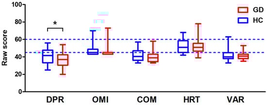 To evaluate the difference in cognitive function between the two groups during CPT, scores were calculated for detectability (DPR), commission error (COM), omission error (OMI), hit reaction time (HRT), and variability (VAR) (Figure 2). DPR indicates the ability to distinguish between targets (any letter except ‘X’) and non-targets (letter ‘X’), and COM and OMI indicate errors caused by a missed target and a response to a non-target, respectively. HRT refers to the average time taken to respond to the target, and VAR is the consistency of HRT between blocks of CPT. A lower score for each item indicates better performance on cognitive tasks. When comparing the GD and HC groups for each CPT item, there were no significant differences except for DPR (DPR, t = 2.144, p = 0.035). When the average score of each item was compared with the 45–60-point interval, which corresponds to the average range of a normal person without underlying disease, both the GD and HC groups had the same or lower values than the corresponding interval.