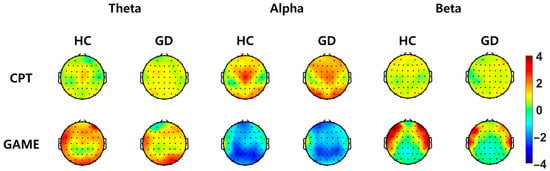 Topographical map for each frequency band of EEG power increase (%) compared with the corresponding baseline for groups of healthy controls (HC) and gaming disorder (GD) participants (left: Theta; middle: Alpha; right: Beta). Red indicates an increase compared with the baseline period, and blue indicates a decrease compared with the baseline period. The upper column shows the amount of increase in EEG power during a continuous performance task (CPT), and the lower column shows the amount of increase in EEG power when playing a game (GAME).