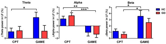 Amount of increase in EEG power compared with baseline by frequency band in the left frontal area for healthy controls (HC) and gaming disorder (GD) participants (%) (left: Theta; middle: Alpha; right: Beta). Blue indicates the value for HC, and red indicates the value for GD. The left side of each graph shows the EEG power increase when performing a continuous performance task (CPT), and the right side shows the EEG power increase when playing a game (GAME). (* p < 0.05, ** p < 0.005, *** p < 0.001).