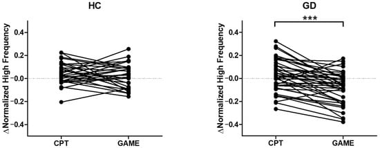 A mixed-model ANOVA revealed no statistically significant interaction between the group and task in HRV-HF power (F [1, 40] = 1.07, p = 0.428). However, a main-effect analysis showed a significant effect of task on HRV-HF power (p < 0.001). An additional paired t-test analysis (Figure 5) revealed a significant difference in the change in HF power between CPT and online video gaming in GD participants, while there was no significant difference observed in HC participants (GD, p < 0.001; HC, p = 0.363).