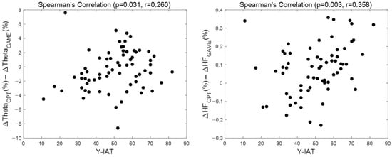 Spearman’s correlation analysis was applied to confirm correlations between GD severity and difference in biomarker response according to tasks to quantify the task-dependent response of cognitive decline in GD. Correlation analysis revealed that the response difference in biomarkers between CPT and online video game play had a significant relationship with gaming-disorder severity (Figure 6). The degree of difference in the response of theta band and HRV-HF between CPT and online video gaming was significantly associated with Y-IAT score (theta, p = 0.031, r = 0.260; HRV-HF, p = 0.002, r = 0.357).