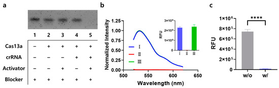 - Liu, X.; Kang, X.; Lei, C.; Ren, W.; Liu, C. Programming the Trans -Cleavage Activity of CRISPR-Cas13a by Single-Strand DNA Blocker and Its Biosensing Application. Anal. Chem. 2022, 94, 3987–3996. [Google Scholar] [CrossRef]