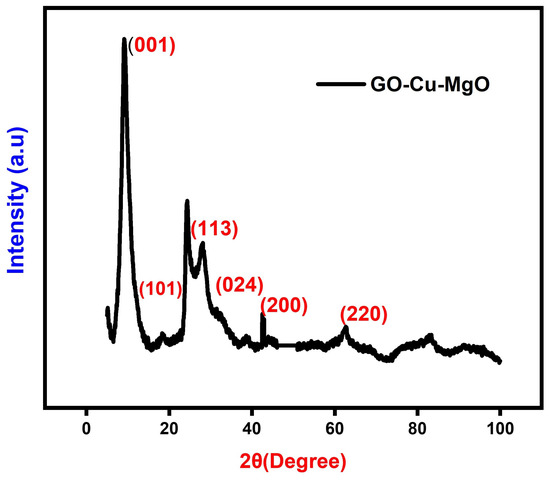 The X-ray diffraction (XRD) patterns depicted in Figure 4 offer further insights into the microstructures of the GCM nanoparticles (NPs). A prominent peak in the XRD pattern at is consistent with the crystal structure of graphene oxide () [16]. However, this peak is absent in the XRD pattern of NPs, indicating that the presence of copper nanoparticles (Cu NPs) altered the surface structure of . In the XRD pattern of NPs, diffraction peaks observed at , , and were identified as the (101), (113), and (024) crystalline planes, respectively, resembling the crystal structure of paratacamite (, JCPDS file no. 87-0679). The peaks at and correspond to (200) and (220) planes, respectively, confirming that magnesium oxide () exhibits a cubic structure consistent with JCPDS 75-1525 [17]. The doping process exhibited identical diffraction peaks, indicating that a minimal amount of dopant content remained undetectable. The average crystallite size was calculated using the Debye–Scherrer equation, yielding a value of 23.28 nm. Additionally, the calculated d-spacing of 0.31 nm was attributed to the (200) lattice plane of cubic .