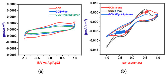 The electrochemical profile for Pyocyanin detection was systematically investigated through cyclic voltammetry (CV) experiments, primarily utilizing a Glassy Carbon Electrode (GCE). The preliminary phase of experimentation involved two distinct conditions: one devoid of Pyocyanin and the other with the presence of Pyocyanin, as illustrated in Figure 6a. These initial experiments indicated that the GCE alone exhibited limited efficacy in detecting Pyocyanin. In response to this observation, a subsequent series of CV analyses were conducted using a GCE coated with a specialized Graphene–Carbon Nanotube Composite (GCM) material. This coating was strategically designed to augment the detection capabilities of the GCE. The analysis was carried out in three distinctive cases, each serving a unique purpose directed towards comprehensively understanding the electrochemical behavior. The first case involved performing CV without Pyocyanin in order to establish a baseline for the electrode’s behavior. This baseline provided crucial insights into the intrinsic characteristics of the coated electrode in the absence of the target analyte. The second case entailed the introduction of Pyocyanin, facilitating an assessment of the electrode’s response to the presence of this specific analyte. This step was essential for understanding the electrode’s sensitivity and selectivity towards Pyocyanin. Finally, the third case integrated both the aptamer and Pyocyanin into the experimental setup. This configuration allowed for a thorough evaluation of the synergistic effect between the aptamer and Pyocyanin on the electrode’s performance. The results of these experiments are depicted in Figure 6b, illustrating the variations in the electrochemical response under different conditions.