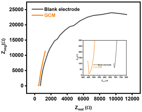 Electrochemical Impedance Spectroscopy (EIS) spectra comparing the impedance characteristics of the Glassy Carbon Modified (GCM) electrode and blank electrode, providing insights into their electrochemical behavior and surface properties.