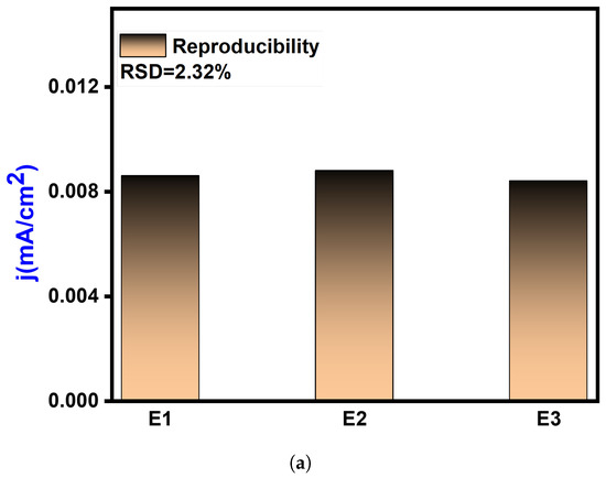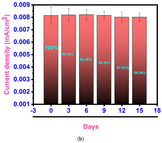 When assessing sensing devices, it is crucial to consider their reproducibility, repeatability, and stability as significant characteristics. Repeatability refers to the consistency of successive readings obtained with the same electrode. To verify the repeatability, a single modified GCE was utilized thrice daily. The relative standard deviation (RSD) of the repeatability was calculated to be 1.03%, indicating that the proposed sensor exhibits exceptional repeatability. Reproducibility refers to the similarity of results obtained using multiple instances of the same modified electrodes and measurement techniques. In this study, after introducing Pyocyanin, the CV responses of three independent electrodes were recorded under ideal conditions. The RSD of the response currents for different GCM NC electrodes was only 2.32%, indicating high consistency (Figure 9a). The durability of the suggested electrochemical sensor was assessed by storing the GCM NC-modified GCE electrodes in the air and monitoring the current response. As depicted in Figure 9b, after 15 days in the air the response current of the GCM NC-modified GCEs retained around 96.96% of its initial value, demonstrating good storage stability. Furthermore, the sensor’s reactivity towards the substrate takes some time to reach a steady state from the moment it is immersed in the electrolyte. It was observed that it took 2 s for the sample to achieve a steady current after being added to the sensor.