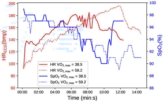 The continuous line correlates with an athlete with medium fitness ( = 38.5 mL/(kg·min), and the dotted line with an athlete of excellent fitness ( = 59.2 mL/(kg·min). The latter demonstrates a longer duration of exercise, indicative of superior cardiovascular and respiratory endurance. Interestingly, this athlete also experiences more pronounced fluctuations. The notable variability observed in the athlete with higher reflects this efficient oxygen utilization, which is particularly evident during periods of intense physical activity [,].