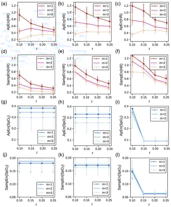 Across the panels, SampEn values consistently appear lower than ApEn values for both HR and . ApEn can be biased, especially for short datasets, as it counts self-matches, leading to higher values. In contrast, SampEn eliminates this bias by excluding self-matches, often resulting in lower values [].