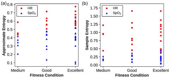 For a deeper insight, Figure 3 illustrates the values of ApEn and SampEn with the parameters set for and . Each dot represents an athlete’s entropy values, with red dots denoting heart rate data and blue triangles indicating peripheral oxygen saturation () data. Analyzing these entropy measures across fitness categories reveals a trend suggesting that higher fitness levels correlate with increased complexity in physiological time series data, although the relationship is not strictly linear.