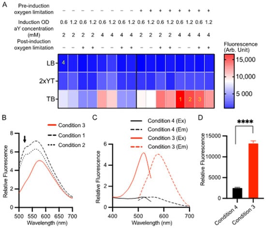 Previously, we successfully expressed aY-sfGFP in sealed containers with a medium volume approximately equal to 1/5 of the container’s volume [38]. This approach, referred to as “oxygen limitation,” was implemented due to the sensitivity of aY to oxidation by molecular oxygen. Protein expression was induced using 0.2% L-arabinose at a temperature of 30 °C. In this study, we conducted a more comprehensive optimization of aY-cpGFP expression by assessing 48 different protein expression conditions (Figure 1A). We manipulated factors such as medium composition, oxygen availability, cell density at induction, and aY concentrations. Throughout the optimization process, we maintained consistent inducer concentrations (0.2% L-arabinose) and expression temperatures (30 °C). Our findings indicate that both increased medium nutrition levels and pre-induction oxygen limitation consistently resulted in higher protein expression levels (Figure 1A). Notably, the highest red fluorescence was observed when aY-cpGFP was expressed in TB medium with 4 mM aY, utilizing pre-induction oxygen limitation and inducing at OD600 = 0.6, while post-induction oxygen limitation was not implemented (referred to as condition 1 in Figure 1A). However, upon closer examination of the emission spectrum, it became apparent that there were also green-emitting species present (Figure 1B). We thus further examined the emission spectra of cell lysates from two additional conditions (Conditions 2 and 3 in Figure 1A) that exhibited strong red fluorescence. Among these conditions, post-induction oxygen limitation (Condition 3) yielded the best outcome with minimal undesired green emission. Consequently, we referred to this condition as “the optimized condition”, which involved using 4 mM aY, inducing at OD600 = 0.6, and implementing both pre- and post-induction oxygen limitation. By employing this optimized expression condition, we could consistently obtain the pure aY-cpGFP proteins with a single excitation (λex = 521 nm) and emission (λem = 590 nm) peaks (Figure 1C). Moreover, the optimized expression condition has resulted in a satisfactory protein production level, as evidenced by the remarkably increased fluorescence intensity (Figure 1D). Following the Ni-NTA affinity purification, the protein underwent size-exclusion chromatography, which indicated a predominantly monomeric nature (Supplementary Materials, Figure S1). The successful incorporation of aY into this protein was further verified through mass spectrometry analysis (Figure S2).