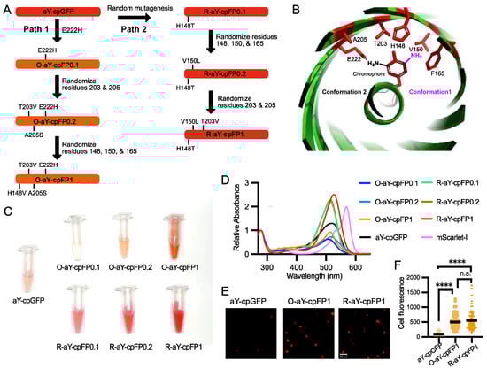 In addition, we re-determined the photophysical properties of aY-cpGFP using the pure protein. Moreover, we explored the impact of mutating specific amino acid residues surrounding the chromophore on the brightness of aY-cpGFP. We successfully obtained brighter mutants by introducing mutations to a small number of amino acid residues. The resulting mutants exhibited photophysical properties that were comparable to those of commonly used cpRFP-based biosensors [8,46,47]. Interestingly, starting with mutagenesis targeting residues on one side of the chromophore (E222, T203, and S205) or the other side (H148, V150, and F165) resulted in the creation of two distinct sets of aY-cpFPs, exhibiting quite different emission wavelengths and some other biophysical properties. This finding provides valuable insights into the structural and functional aspects of aY-cpFPs and opens up possibilities for further optimization.