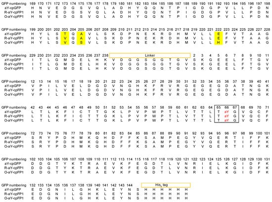 Sequence alignment of aY-cpGFP, R-aY-cpFP1, and O-aY-cpFP1. Mutations are highlighted in yellow. In the black box are the amino acid residues responsible for chromophore formation. The residues are numbered following the wild-type GFP.