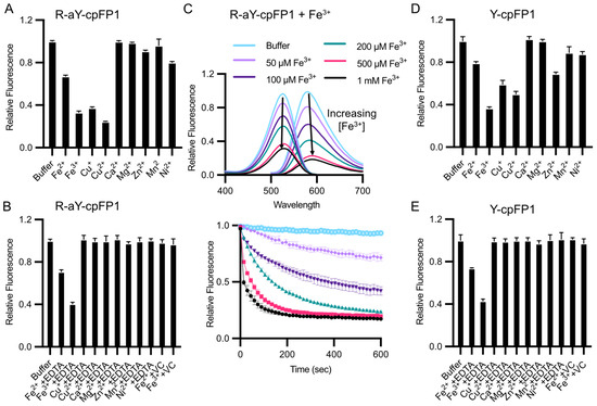 Sensitivity of R-aY-cpFP1 and Y-cpFP1 to metal ions. (A) Normalized fluorescence intensity of 500 nM R-aY- cpFP1 treated with various metal ions (100 μM). (B) Normalized fluorescence intensity of 500 nM R-aY-cpFP1 first treated with the indicated metal ions (100 μM), followed by 10 mM EDTA or 50 mM vitamin C (VC) for another 15 min. (C) Top panel: Fluorescence excitation and emission spectra of 500 nM R-aY-cpFP1 after 2 min treatment with Fe3+ at the indicated concentrations. Bottom panel: Time-lapse traces (F/F0) of fluorescence intensity of 500 nM R-aY-cpFP1 treated with Fe3+. (D) Normalized fluorescence intensity of 500 nM Y-cpFP1 treated with various metal ions (100 μM). (E) Normalized fluorescence intensity of 500 nM Y-cpFP1 first treated with the indicated metal ions (100 μM), followed by 10 mM EDTA or 50 mM vitamin C (VC) for another 15 min. The top panel in (C) presents one trial of representative results. Other panels present mean ± SD from three technical replicates.