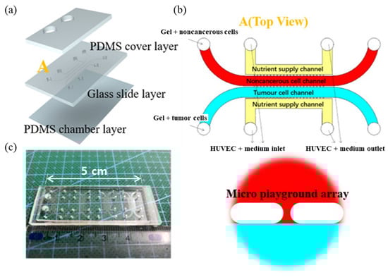 Three-dimensional tumor–macrophage system. (a) Illustration of the microfluidic device for coculture, (b) cell culture chamber layer and close-up view of the micro layer with a close-up view of the micro playground array section. (c) Photograph of the microfluidic system. A total four sets of tumor–macrophage systems were implemented on a single chip, and the overall horizontal length of the system was 5 cm. Reprinted with permission from [68].