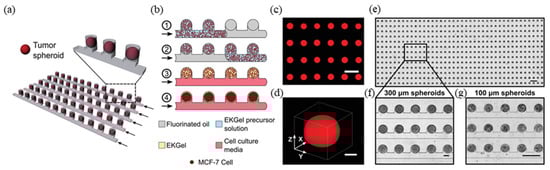 Microfluidic arrays of MCF-7 breast tumor spheroids. (a) Schematic of the microwell device with several parallel rows of tumor spheroids. (b) Schematic of the microwell-based tumor spheroid generation. (c) Fragment of an array of rhodamine-B labelled cell-free microgels, Scale bar is 500 µm. (d) 3D confocal microscopy image of the rhodamine-B labelled microgel. The scale bar is 100 µm. (e) A portion of an array of 300 µm diameter MCF-7 breast cancer spheroids after 48 h culture. Scale bar is 1 mm. (f) Close-up view of array in (e). (g) 100 µm diameter MCF-7 breast cancer spheroids in an MF array after 48 h of cell culture. The scale bars in (f,g) are 200 µm. Reprinted with permission from [38].