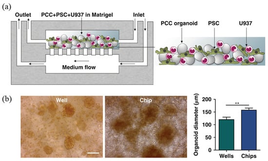 Pancreatic cancer-on-a-chip. (a) Schematic of primary cancer cell (PCC) + stromal cell seeding on the microfluidic device. (b) Comparison between well-grown organoids and chip-grown organoids. Organoids that grew on a chip had a significantly greater diameter than the organoids grown in a welled plate. Scale bar, 100 µm. * p < 0.05, ** p < 0.01. Reprinted from [69] with open access.