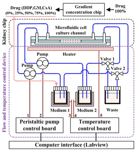 Co-culture microfluidic kidney chip system with flow and temperature control devices. The temperature of the chip and the cell culture medium can be maintained by adjusting the heating plate. Two pumps can regulate the flow rate of the cell culture medium into the chip. Reprinted from [70] with open access.
