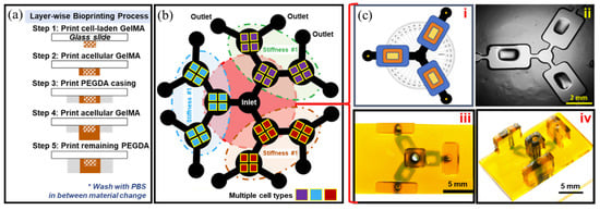 3D bioprinted hydrogel microfluidic chip design. (a) Bioprinting process of microfluidic multi-material fabrication. (b) The schematic figure of the chip including channels. (c) The chosen hydrogel-based microfluidic design; (i) The microfluidic chambers arranged in equal angular distribution (120°) for uniform flow rate and discharge with a single inlet and three different outlets, (ii) 3D bioprinted preview showing the culture chamber and culture area, (iii) top view of the 3D bioprinted microfluidic platform, (iv) perspective view of the 3D bioprinted microfluidic platform. Reprinted with permission from [46].