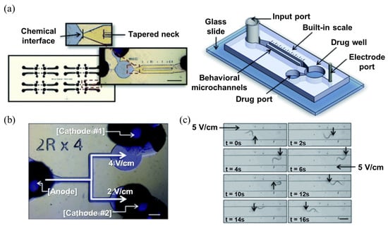 An intrinsic locomotion characteristic of C. elegans that has been utilized for drug screening is “electrotaxis”, a behavioral characteristic that causes C. elegans to head toward the cathode under an electric field [100]. This behavioral characteristic is based on neural circuits that are involved in the process of sensing electric fields and moving. Therefore, if the neurons in the relevant neural circuits are damaged by certain substances, the worm may not exhibit normal electrotaxis, or it may show obvious differences, such as a change in the strength of the electric field it responds to, or a slower response time. In contrast, treatment with a substance that has neuroprotective effects may improve the aforementioned symptoms of neuronal damage. Therefore, electrotaxis can be used as a screening target for substances involved in major neurological diseases. In a representative study using electrotaxis as an analytical target, a PDMS-based microfluidic system with input and drug wells on either side of a straight behavioral microchannel was constructed [37]. Electrodes were inserted at both ends of the channel to apply an electric field to the entire channel (Figure 7), and after introducing worms into the chip, an electric field of 5 V/cm was applied to check electrotaxis, and furthermore, levamisole, a type of anthelmintic drug, was selected as a test drug to verify behavioral changes caused by the drug.