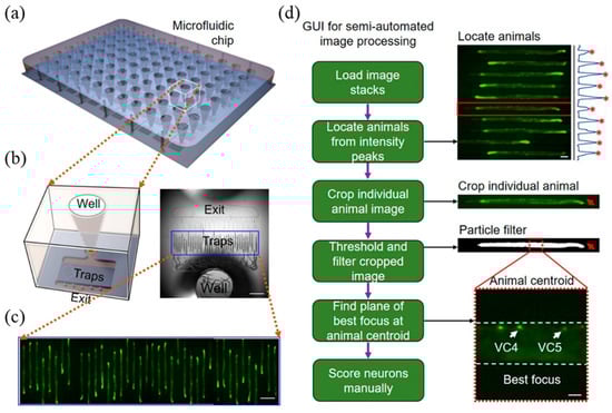 Microfluidic chips have shown that these challenges can be overcome with a variety of strategies. For example, a drug screening platform was developed by designing a channel that fits the width of the C. elegans body, introducing worms into the channel, and physically immobilizing the worms in a linear shape [29,33]. Based on this strategy, a 96-well microfluidic chip was developed that can be utilized for drug screening [29]. The platform has more than 40 microchannels at the bottom of each well that can trap C. elegans in a linear manner, enabling the researchers to test more than 3000 worms in a single 96-well platform with high-throughput (Figure 8). High-quality fluorescence imaging can be effectively achieved with C. elegans by using channels designed to match their body width. Additionally, the implementation of semi-automated image processing enables the rapid analysis of these fluorescence images, facilitating the handling of a substantial volume of images efficiently in a short time. After introducing C. elegans into the system, C. elegans were treated with bexarotene and norbenzomorphan as test drugs, and the degree of neural recovery caused by these substances was analyzed through fluorescence imaging. This HTS-based drug screening platform has been established to screen chemicals that can be indirectly utilized as treatments for human neurodegenerative diseases, with a particular focus on neurodegenerative diseases, and to discover substances that can be utilized as new neurorestorative drugs.