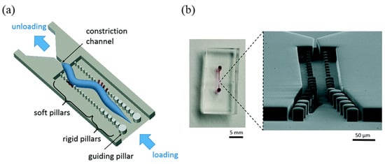 Microfluidic thrashing force assay chip for C. elegans. (a) Schematic figure of the microfluidic device showing the constriction channel for partial immobilization and the micropillars for lateral force–deflection measurements. (b) An optical image (left) and scanning electron micrograph (right) of the device and channel. Reprinted with permission from [53].