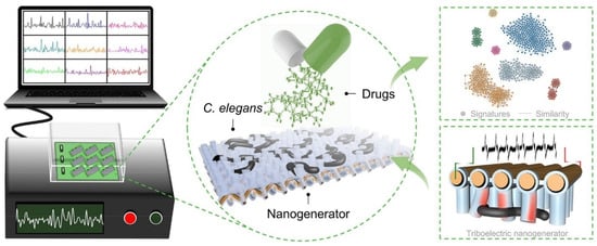 Hierarchically structured biohybrid triboelectric nanogenerators (HB-TENGs) enable high-throughput drug screening on a large scale of C. elegans. Reprinted with permission from [30].
