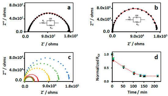 Dynamics of EIS for freshly prepared bare and MHA SAM-coated gold IDA. Initial EIS in Nyquist representations of (a) bare and (b) MHA SAM-coated gold IDA, and (c) EIS spectrum of MHA SAM-coated gold IDA successively recorded at different times. (d) Time dependence of normalized Rct values due to the combined effect of incubation in 5 mM [Fe(CN)6]−3/4 containing 10 mM Tris buffer at pH 7.4 and intermittent EIS scanning for five different freshly prepared MHA SAM-coated gold IDAs. The red solid curve in (a,b) is the Randles equivalent circuit model (inset) fits to the experimental data.