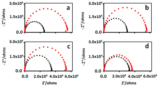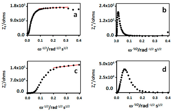 In the EIS spectrum, the real (Z′) and the imaginary (Z″) part of the Nyquist plot can be fitted with Equations (5) and (6) [89,90]