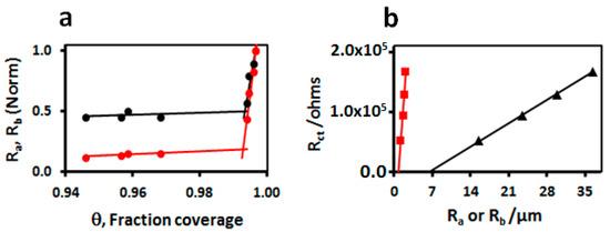which in turn is related to pinhole radius (Ra) and half the distance between the centers of the adjacent pinholes or pinhole separation radius (Rb) in the monolayer coated gold IDA electrode, as depicted in Scheme 1, and described by the relationship given below, Equation (12).