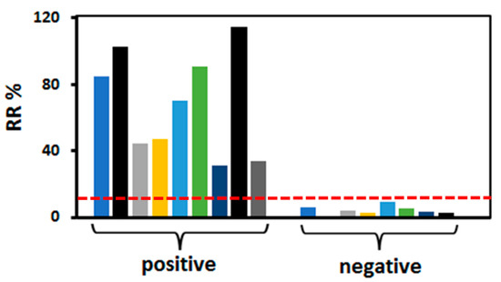 Impedance response to different concentrations of anti-SARS-CoV-2 IgG1 antibody as presented by the standard calibration curve (Figure 5) indicates the potential suitability of the developed biosensor for determining the presence/absence of anti-SARS-CoV-2 antibodies in human serum samples. Figure 6 shows the test results obtained using MHA Au-IDA biosensor for serum samples collected from nine patients which have COVID-19 antibody and eight patients which do not have COVID-19 antibody as tested using a commercial serology assay. These patients have also been confirmed to be either COVID-19-positive or COVID-19-negative using a nucleic acid test [98,99,100,101]. A protocol similar to that used for the determination of the standard curve is adopted to test clinical human serum samples. Figure 6 shows that the impedance response (RR%) varies with patient, indicating the varying amount of antibodies present in the sera as expected. For patients which have tested anti-SARS-CoV-2 antibody positive, the RR% values are significantly above the dotted line indicating the LOD of the biosensor and, on the other hand, for patients which have tested anti-SARS-CoV-2 antibody negative, the RR% values are below the LOD as expected. Based on the limited number serum samples analyzed in this study, the sensitivity and specificity of the biosensor can be estimated to be 100%.