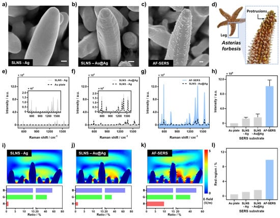 SEM images of (a) SLNS-Ag, (b) SLNS-Au@Ag, and (c) AF-SERS substrate (scale bar: 100 nm). (d) Image of the legs and protrusion structures of the Asterias forbesi. Raman spectrum comparison data for 100 μM R6G, a Raman emitter: (e) Bare Au plate and SLNS-Ag substrate (Gray scale: SLNS-Ag, Black dotted line: Au plate), (f) SLNS-Ag and SLNS-Au@Ag substrate (Gray scale: SLNS-Au@Ag, Black dotted line: SLNS-Ag), and (g) SLNS-Au@Ag and AF-SERS substrate (Blue scale: AF-SERS, Black dotted line: SLNS-Au@Ag), respectively. (h) Raman intensities at 1508 cm−1, a specific peak of R6G on various SERS substrates (Au plate, SLNS-Ag, SLNS-Au@Ag, and AF-SERS, respectively). FEM-based electromagnetic simulation results and RGB value graph for each area of (i) SLNS-Ag, (j) SLNS-Au@Ag, and (k) AF-SERS substrate. (l) Ratio of the red region (in (i–k)) for each substrate.