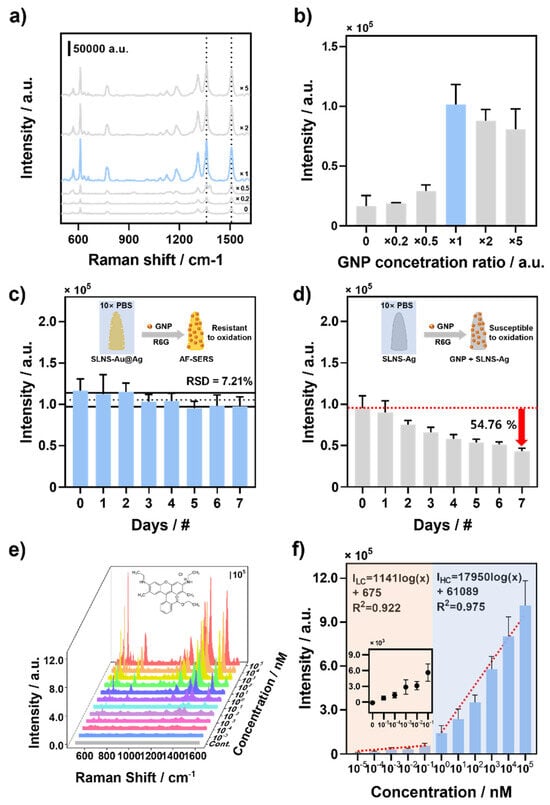 Initially, a series of SLNS-Ag and SLNS-Au@Ag were prepared and exposed to a challenging 10× PBS (phosphate-buffered saline, 100 mM) environment. Subsequently, these particles were individually retrieved on specified days and thoroughly washed with ethanol (EtOH) and DI water. Afterward, 5 μL of GNP solution combined with 100 μM R6G in a 1:1 ratio were deposited onto the washed substrates containing SLNS-Ag and SLNS-Au@Ag. Subsequently, the variations in the Raman spectra of R6G on each substrate were measured daily.
