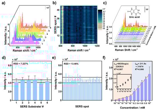 Subsequently, the suitability of the AF-SERS substrate for UA detection was examined, considering the reproducibility between substrates, random spot reproducibility, and UA detection performance (Figure 3). The normal Raman spectrum of uric acid is depicted in the following figure, with band assignment displayed in Table S2. Initially, six different AF-SERS substrates were fabricated, and each substrate was reacted with a consistent 5 μL of 100 μM UA (Figure 3a). The specific Raman peak of UA occurred at 640 cm−1, and each substrate exhibited a consistent spectral pattern (Figure 3a). Subsequently, the Raman intensity at 640 cm−1 was compared for the six substrates (Figure 3d), revealing excellent repeatability with an RSD value of 7.227%.