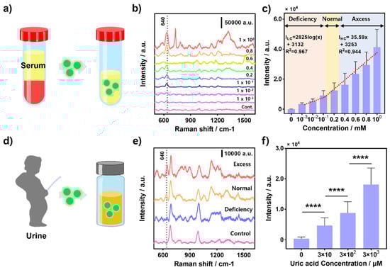 Actual samples for detecting UA include human blood and urine. Therefore, to validate the detection capability of UA within the body using the AF-SERS-substrate-based UA sensor, we designed experiments for UA detection in human serum and real urine samples (Figure 5). First, for UA detection in serum, human serum was diluted at a 1:10 ratio (Figure 5a). Subsequently, UA was mixed into the diluted serum at various concentrations to prepare the samples. Samples were prepared from 1 mM to 1 μM, including a concentration of 200–500 µM, which corresponds to the normal range of UA in human serum. As shown in Figure 5b, the Raman signal at 640 cm−1 changes significantly as the concentration of UA changes. Specifically, the Raman intensity results by concentration at 640 cm−1 and specific Raman peak of UA are shown in Figure 5c. A log-linear increase is observed at low concentrations (1–100 μM), corresponding to conditions in which UA deficiency is anticipated. In contrast, a linear increase is observed at high concentrations (200 μM–1 mM), which are high-risk UA concentrations. The log-linear equation for low concentrations was calculated as ILC = 2825 × log(X) + 3132 (R2 = 0.967), and the linear equation for high concentrations was calculated as IHC = 35.59X + 3253 (R2 = 0.9644). Specifically, X denotes the concentration of UA (mM) in serum. The LOD of UA in serum was determined to be 1.05 μM using the LOD formula. The results indicate a decrease in sensitivity compared to the laboratory environment because various proteins in the serum act as interfering factors. However, despite this, the AF-SERS substrate exhibited detection performance, which far exceeded the normal range.