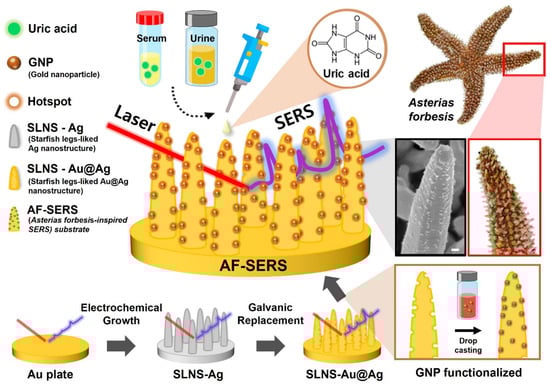 In this study, we drew inspiration from the morphology of Asterias forbesi, commonly known as the Forbes Sea Star, to enhance the performance of the SERS substrate. Asterias forbesi exhibits numerous protrusions on its torso and legs, resembling structures in which the SERS effect can be maximized by creating nanoscale hotspots. To replicate this structure, we strengthened the SERS effect by fabricating small-scale gold nanoparticles (GNPs) in a gold–silver bimetallic structure, imitating starfish legs and the protuberances of Asterias forbesi. This design maximized the SERS effect by increasing the adhesion area with UA and promoting hotspot creation. The Asterias forbesi-inspired SERS (AF-SERS) substrate demonstrated an outstanding SERS effect; this result was further confirmed through electromagnetic field simulations. Using the AF-SERS substrate, UA was detected across a wide range of samples, including serum and human urine. Moreover, the substrate enabled the specific identification and detection of UA among various endogenous metabolites. These findings showcase the promising potential of the developed AF-SERS substrate as a sensor platform not only for UA but also for various targets in real-world field settings.