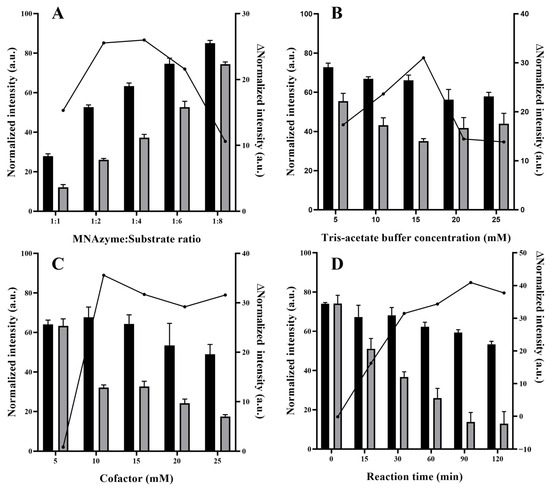Optimization of the Hg2+ detection assay. (A–D) Normalized intensity at different ratios of MNAzyme to substrate, different Tris-acetate buffer concentrations, different cofactor concentrations, and different reaction times. The black and gray bars represent the absence and presence of Hg2+ (100 ppb), respectively. ∆Normalized intensity is calculated by subtracting the normalized intensity in the presence of Hg2+ (100 ppb) from the normalized intensity in the absence of Hg2+. In (A), the concentration of MNAzyme was fixed at 50 nM, while the concentration of substrate was varied from 50 to 400 nM. Error bars represent the standard deviation from three independent experiments.