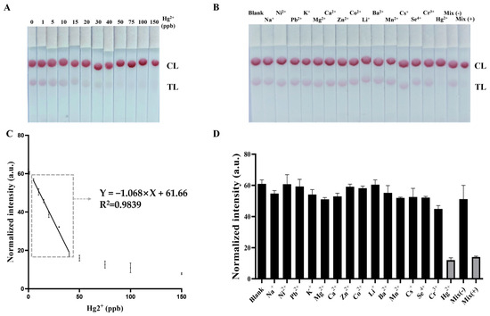 Sensitivity and specificity of the Hg2+ detection assay. (A) Images of NALFA strips for detection sensitivity. (B) Images of NALFA strips for detection specificity. (C) Normalized intensity at various concentrations of Hg2+ (0, 1, 5, 10, 15, 20, 30, 40, 50, 75, 100, and 150 ppb). (D) Normalized intensity in the presence of various metal ions. The concentration of Hg2+ was 100 ppb, while the concentration of the other metals was 1000 ppb. Mix (−) and (+) indicate samples containing 14 metal ions (each 100 ppb) without and with Hg2+ (100 ppb), respectively. In (C,D), “Blank” indicates the sample without Hg2+. Error bars represent the standard deviation from three independent experiments.