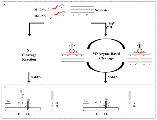 Schematic illustration of the Hg2+ detection assay where (A) MNAzyme-based cleavage reaction occurs only in the presence of Hg2+ and (B) the reaction products are analyzed by the NALFA strip. The lowercase letters indicate the specific region in the DNA oligonucleotide and * indicates their complementary sequences. AuNPs (red circles) are modified with Tag DNA using a heating and dry method, and capture DNA is immobilized on the NALFA strip using our own SAIoNs method (see the experimental details). The 5’-end (e, c*) and 3′-end regions (d*, f) of the substrate hybridize with Tag DNA (e*, c) on the AuNPs and with the capture DNA (d, f*) in the test line (TL) of the NALFA strip, respectively. Thus, the substrate, produced only in the absence of Hg2+, can bind to both capture DNA and Tag DNA, generating an intense color signal in the test line of the NALFA strip, which does not occur in the presence of Hg2+ that induces MNAzyme-catalyzed cleavage reactions. In the case of the control line (CL), the capture DNA (e, c*) hybridizes with Tag DNA (e*, c) on the AuNPs, thereby generating the colorimetric signal regardless of the presence or absence of Hg2+. Not all DNA oligonucleotides entail chemical modifications.