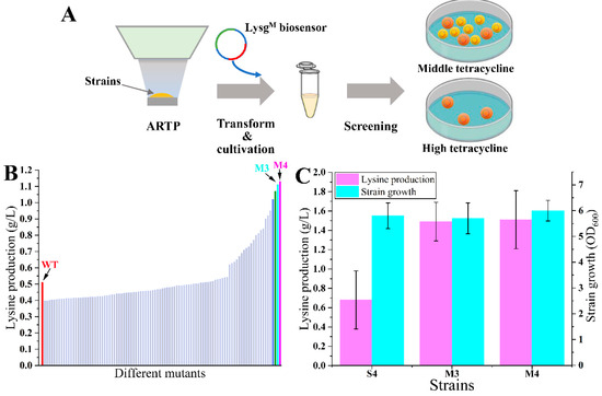 First, strain P4 was used for random mutagenesis through Atmospheric and Room Temperature Plasma (ARTP) irradiation. The ARTP irradiation was performed as described former (with the power at 125 W, flux 10 SLM, and 60 s) [7]. Five samples after ARTP irradiation were individually inoculated to an OD600 of 0.6 and prepared as competent cells. The biosensor plasmid pSB4K5-lysGM-PlysE-tetA was transformed into mutants subsequently. Strain S4 was used as the control strain. After cultivation at 37 °C for 12 h, different mutants from each sample were spread over M9 agar plates with tetracycline. After cultivating for 60 h on the plates, the bigger colonies were randomly selected. The growth and lysine concentrations of these mutants were tested in the M9 medium without tetracycline.
