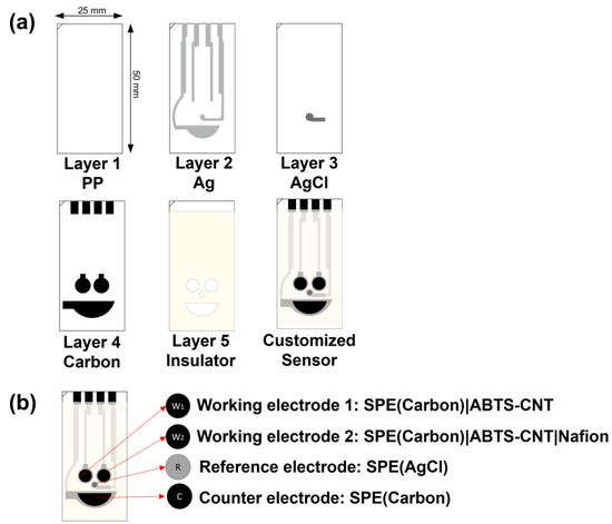 The customised electrode was fabricated through a five-layer manufacturing process, with overall dimensions of 25 mm × 50 mm × 0.5 mm (Figure 1a). The first PP layer, with a thickness of 0.5 mm, served as the base of the electrode and was selected for printing Ag, AgCl and carbon. The second Ag layer was designed to transmit electric current for the three-electrode system. The AgCl reference electrode (RE) was printed on the third layer. The fourth carbon layer consisted of two circles (ø = 5.00 mm), which were screen-printed electrodes (SPE) that functioned as the dual working electrodes (WEs). The half-oval one was the counter electrode (CE), and four pins connected the electrochemical system. The final layer was the photocuring-printed ultraviolet ray resin (PICS-Isolation Ink-U001), which functioned as the insulator.