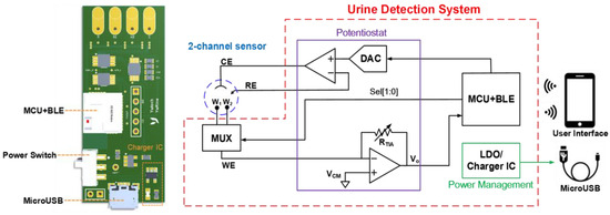 This dual-channel electrochemical urine detection system is developed into a small PCB to be a portable device (Figure 2). The size of the device is only 50 mm × 21.59 mm; thus, it can be easily integrated into our prototype device. Urine detection can be simply executed with the highly integrated PCB and the customised user platform; hence, the device is useful either for personal health administration or home-care systems.