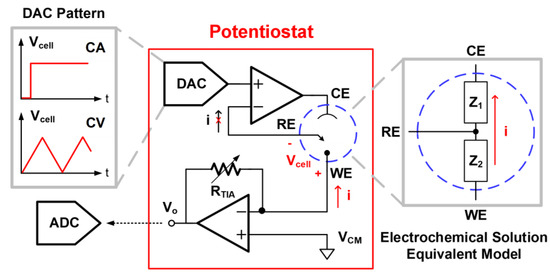 Figure 3 depicts the design of the potentiostat for the CA and CV programmes. The WE is regarded as an electronic provider or receiver under different DAC patterns of Vcell. In CA measurement, the MCU directs the DAC to provide the step wave to the RE, producing a constant potential difference across the WE and RE. The CE works as the current source to provide a current path to the WE, adopting an operational amplifier as the output driver. The mechanism is similar to a non-inverting amplifier operation with an effective feedback network of urine impedance between WE/RE/CE. The RE remains at a fixed potential throughout the reaction in this pattern. In the CV mode, the MCU directs the DAC to implement the triangle wave, causing the varying potential difference at a programmable scan rate. The equivalent impedance model of the electrochemical solution can be described as Z1 (CE to RE) and Z2 (RE to WE). The oxidation or redox current goes through the WE and CE, and no current passes through the RE due to the high input impedance of the operational amplifier through the virtual ground. The reaction current is converted into the voltage domain as an output node of Vo with the TIA. This voltage signal will be quantised by the ADC in the MCU module for further calculation. After signal acquisition, the ADC output signal is transmitted to the smartphone app through BLE. Accordingly, the analyte concentration will be calculated from the ADC output and displayed on our customised user app.