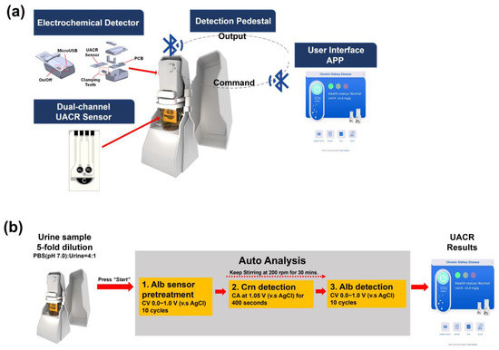 (a) Proposed portable UACR electrochemical system and platform. (b) UACR examination process of the proposed portable electrochemical system and platform.