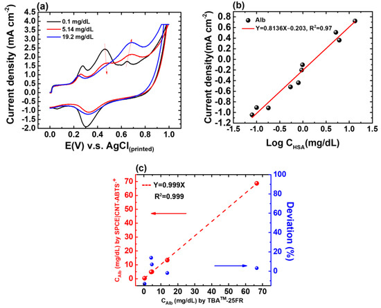 (a) CV responses of the SPE(W1)|CNT-ABTS(CV) to Alb of various concentrations. (b) Calibration curve of the proposed albumin sensor in urine with known concentrations of 0.08, 0.1, 0.18, 0.54, 0.8, 0.94, 0.98, 5.14, 6.1, and 19.2 mg/dL, respectively. (c) Regression analysis of CAlb in five urine samples determined using TBA-25FR and the SPE(W1)|CNT-ABTS(CV) electrode is shown in red; The deviation percentage in the CAlb values determined by TBA™-25FR and SPE(W1)|CNT-ABTS(CV) electrode is shown in blue.