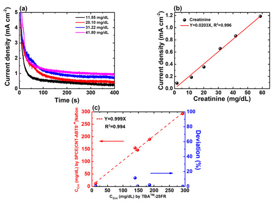 At the beginning of Crn detection, the offset current is detected and subtracted by the developed electrochemical system. After 400 s of the CA programme on SPE(W2)|CNT-ABTS|Nafion, the amperometric responses to the prepared Crn samples with various concentrations are presented in Figure 6a. The normal Crn level in urine ranges from 66.97 to 215.04 mg/dL [31]. The characteristics of the Crn sensor were tested using prepared test samples described in Section 3.1, ranging from 1.67 to 58.62 mg/dL (with initial urine Crn concentrations ranging from 8.36 mg/dL to 293.14 mg/dL before 5-fold dilution). The linear fitting curve of the proposed Crn sensor is shown in Figure 6b, and the linear equation is current density(mA/cm2) = 0.0203 C(Crn) (mg/dL) with R2 = 0.996. The detection limit is estimated to be 0.62 mg/dL.