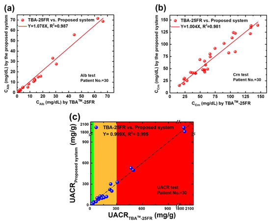 All the collected samples were tested using the proposed system and biochemical analyser. The corresponding results are presented in Figure 7. The x-axis indicates the benchmark results by TBA-25FR. The y-axis shows the experimental results obtained from the electrochemical system and platform. Good agreements can be observed between both methods (slope = 1.078 for Alb, slope = 1.004 for Crn and slope = 0.999 for UACR), with an excellent correlation coefficient in all types of tests (R2 = 0.987 for Alb, R2 = 0.981 for Crn and R2 = 0.995 for UACR). In the significant analysis, the correlation results between the proposed system and the biochemical analyser TBA-25FR are statistically significant (r = 0.992, p < 0.001 for Alb; r = 0.958, p < 0.001 for Crn; and r = 0.997, p < 0.001 for UACR) in two-tailed tests conducted using SPSS Statistics 17.0. The feasibility of the proposed electrochemical platform for UACR urinalysis is confirmed. Moreover, this platform accurately classifies all three CKD risk statuses within 30 min and successfully distinguishes between normal and low-grade albuminuria (10 mg/g to 30 mg/g) for the application of cardiorenal syndrome and stroke risk prediction, with an accuracy of 96.7%, where one low-grade albuminuria sample was misidentified as a normal sample out of 30 samples.